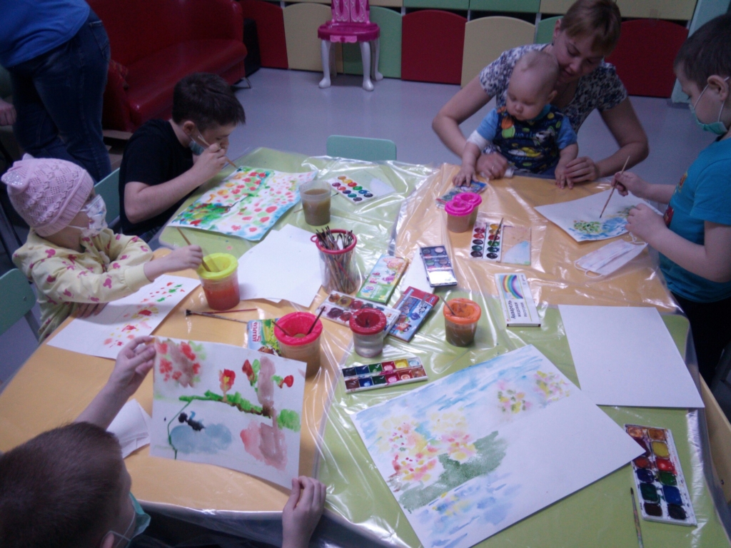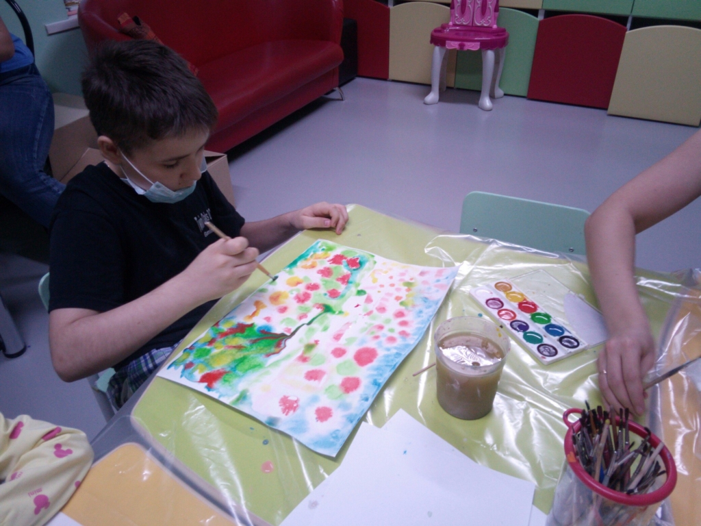 Каждую неделю в детском отделении проходит какой-нибудь творческий мастер-класс. На этот раз была живопись акварелью. Интересный вариант работы с этими красками – дать растекаться акварели во все стороны, и вот листья, ветки, деревья нарисовались сами собой.